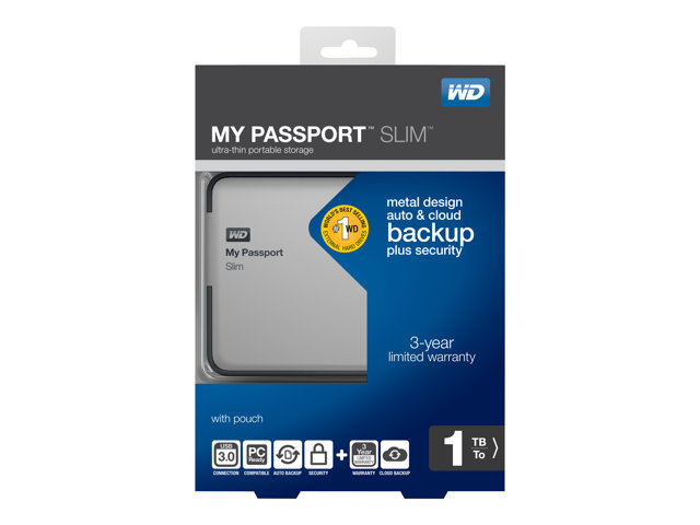 My Passport Slim portable hard drive features WD SmartWare Pro backup software for local or cloud backup, a beautiful, ultra-slim metal design, the blazing speed of USB 3.0 connectivity and the security of password protection with hardware encryption.