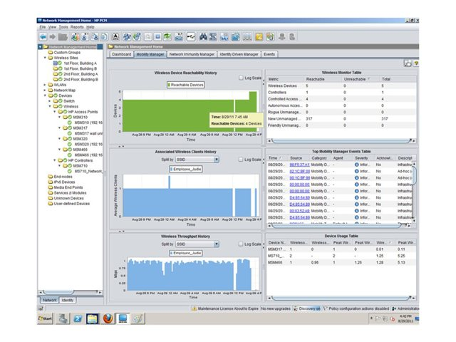 The HP PCM+ Mobility Manager v4 Software Module License provides the high-level as well as detailed information needed to alert you to possible network problems. This information allows you to troubleshoot client connectivity issues related to such problems as weak signals, client overloads, overlapping channels, and overlapping access point coverage.