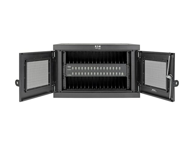 Eaton Tripp Lite Series 32-Device USB Charging Station Cabinet with Sync for Smartphones, Wall Mount and Desktop Options, 230V, Schuko CEE7 to C13 Plug, Black - Laddare för flera enheter skåp - med kretsbrytare - på bord, väggmontering - svart - för P/N: M100-10N-BK, M100-10N-BK-10, SRXFANWM, U326-001-BK